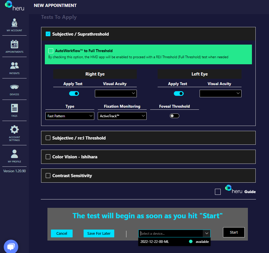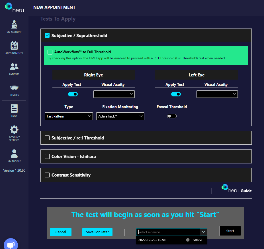 In order to select your device, you need to let the computer know that your headset is ready to begin the exam. In order to do so, you have to make sure the Heru re:Vive app is running on your MagicLeap Device.